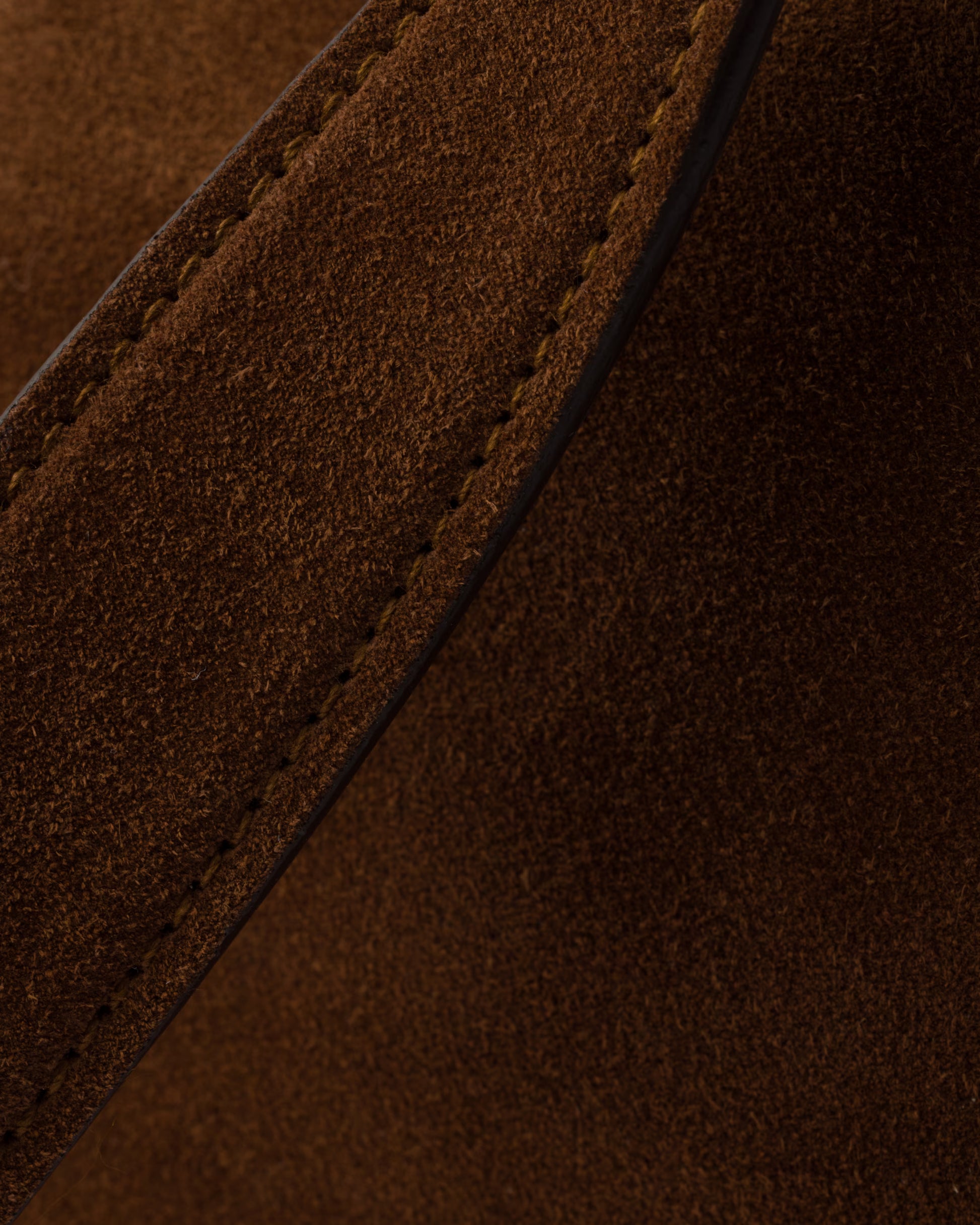 The sophisticated minimalism of the '90s inspires the new Prada Aimée bag. The design evokes the instinctive gesture of holding a bag with its soft suede silhouette, created for effortless wear on the shoulders or cross-body.