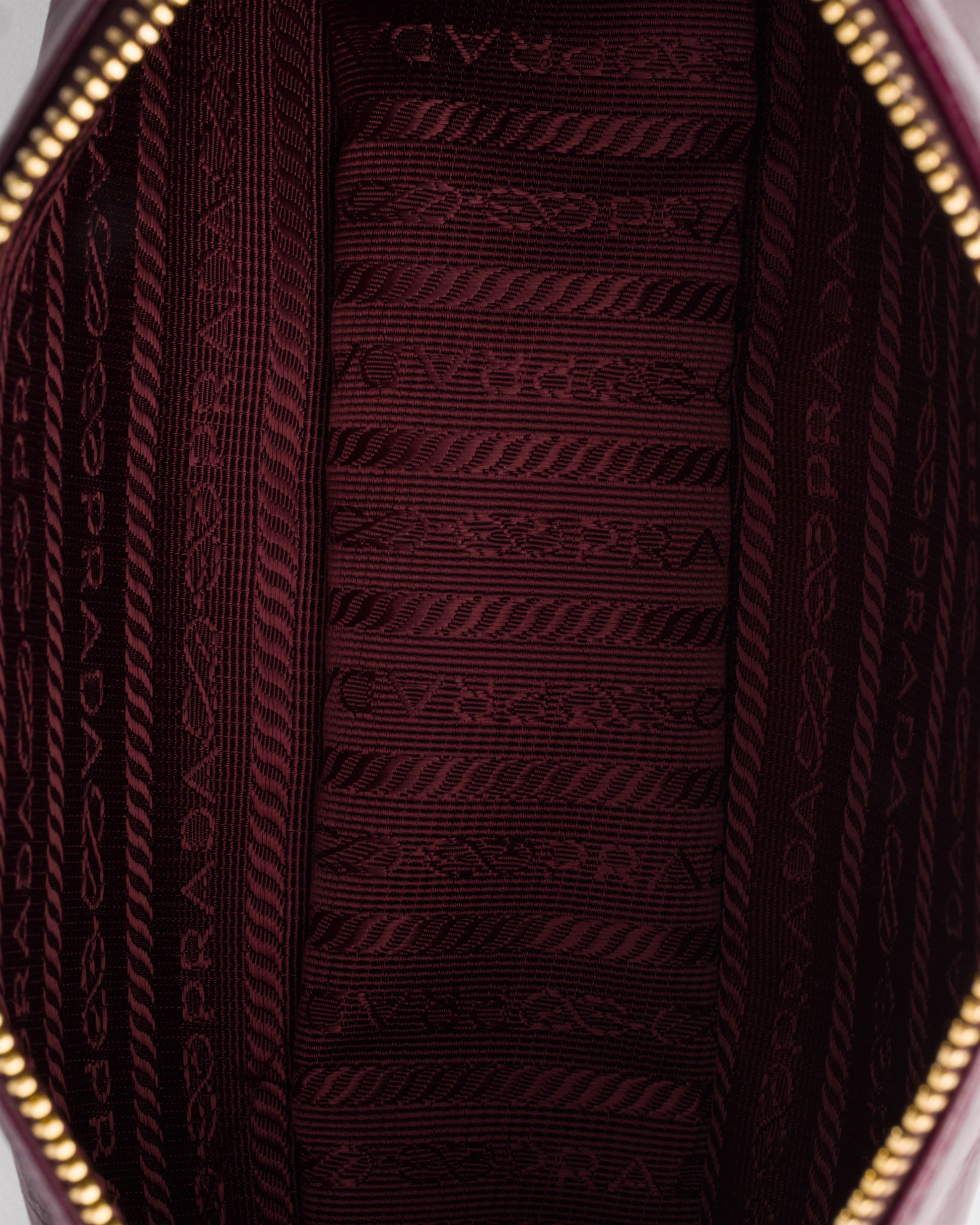 The Re-Edition of an iconic style from 2002, this shoulder bag summarizes Prada's codes in a versatile and refined silhouette that establishes a dialogue between the stylistic language of past and present. Made of leather with a refined shiny finish, the sophisticated, minimalist accessory can be worn from day to night, thanks to the elegant removable chain handle. Brightened by metal hardware, the design is completed by the leather keychain and enameled metal triangle logo.